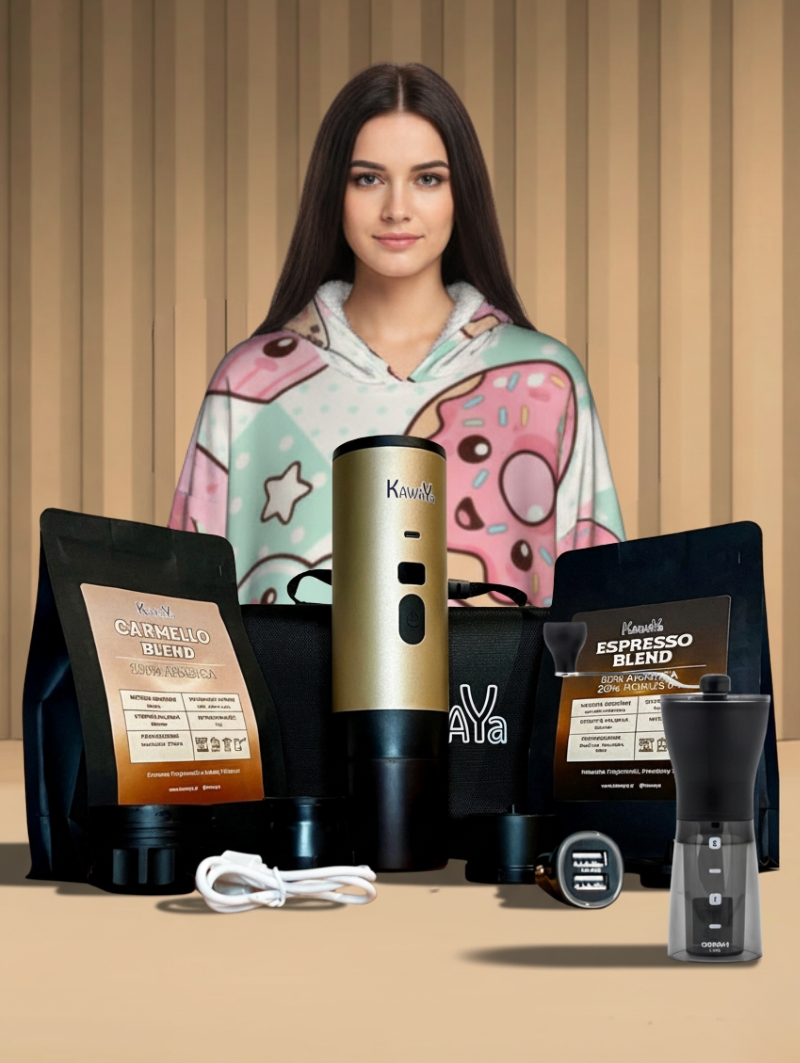 Tworzy go połączenie najwyższej jakości kawowego rytuału i pełnej ciepła wygody: mobilny ekspres KawaYa, świeżo mielona kawa oraz wyjątkowa Kocobluza z motywem słodkiego Kawaii jedzenia.